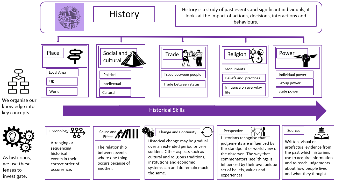 History is the study of people, actions, decisions, interactions and behaviours. Historians seek to understand the past by determining and ordering ‘facts’; and from the narratives of the past, they hope to explain the decisions and processes which shape our existence today. Through the study of history pupils develop a wide range of critical thinking skills, which enable them to understand the contested nature of knowledge and to distinguish between ‘fact’ and subjectivity when it comes to reaching conclusions and making judgements about the past.