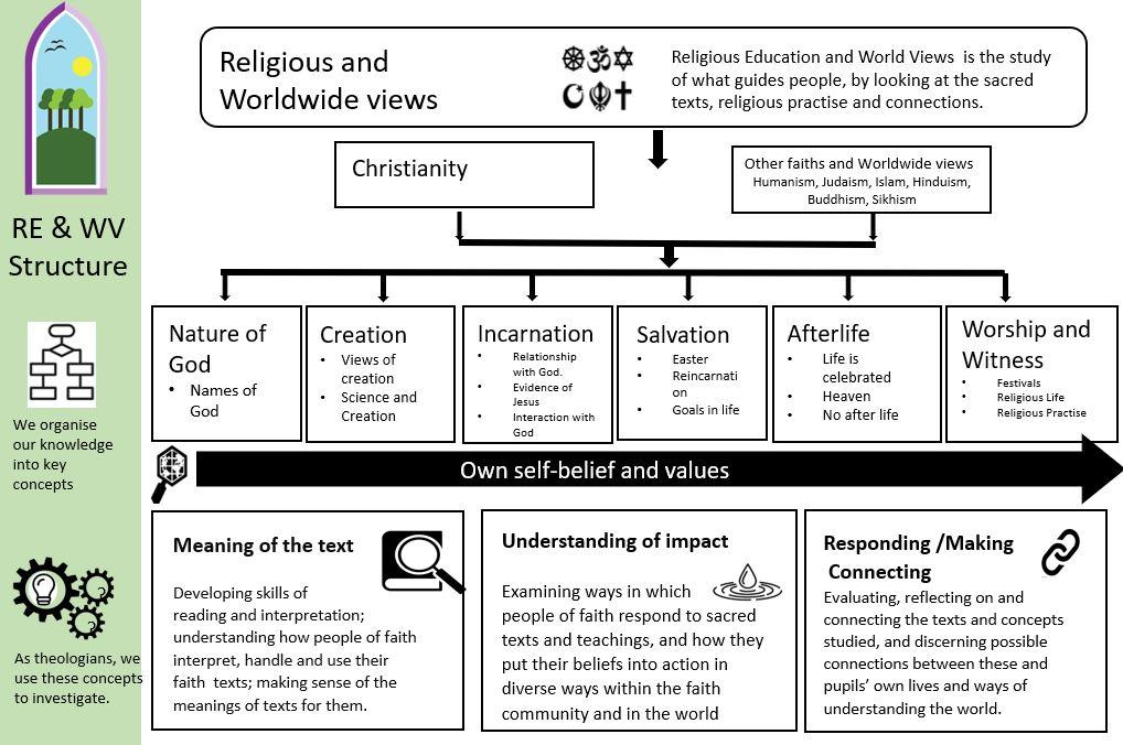 Religious and Worldviews are the interpretive frameworks that form the foundations of people’s lives. Religious and Worldview Education is a discipline dedicated to explaining the beliefs and practises of people throughout the world. It seeks to help pupils understand their own beliefs and values and foster empathy and compassion towards others.  When investigating, their thinking is developed through disciplinary concepts that encourage them to think as a theologian. These concepts form a unique framework of enquiry and shape the questions that theologians investigate.